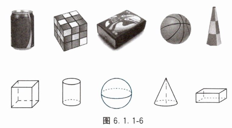 6. 如图6.1.1 - 6,上面一行是一些具体的实物图形,下面一行是一些立体图形,试用线连接立体图形和类似的实物图形。