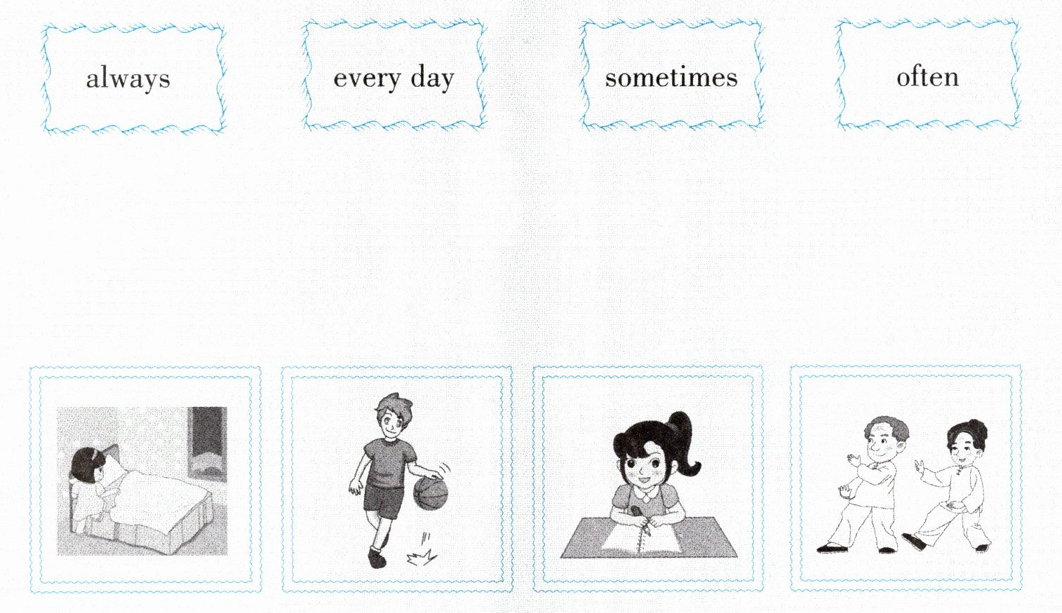 (注:实际答题需根据听力内容,将上方频率词与下方对应图片相连。例如,若听到"She makes the bed every day.",则将"every day"与整理床铺的图片连线。)