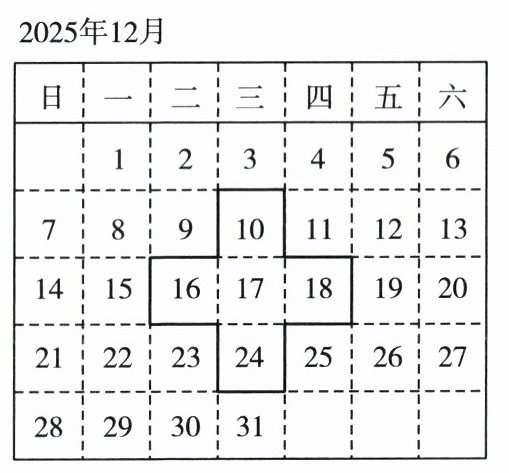 9. 如图,这是2025年12月的日历,用随意圈出五个数,所圈的五个数的和一定( )