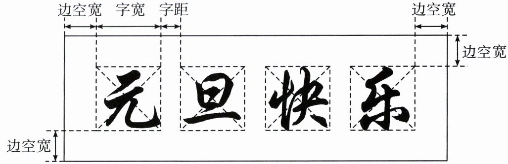 15. 2025 年元旦,小颖在一张长方形宣纸上的四个正方形格子中写下了“元旦快乐”的毛笔书法作品,如图所示. 已知宣纸的长为$108\ cm$,正方形格子的边长相等,正方形格子与纸边之间的边空宽相等,相邻两个字的字距相等,且边空宽、字宽、字距之比为$3:6:2$,则这张长方形宣纸的面积为______$cm^{2}$.