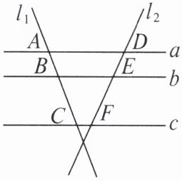 5. 如图,直线$a// b// c$,直线$l_1$,$l_2与这三条平行线分别交于点A$,$B$,$C和点D$,$E$,$F$。若$AB:BC = 1:2$,$DE = 3$,则$EF$的长为____。