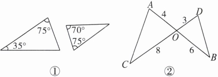 A 题图①中根据三角形的内角和定理,即可求得大三角形的第三个角为70°,由两角分别相等的两个三角形相似,即可判定题图①中的两个三角形相似;题图②根据图形中的已知条件,即可证得$\frac{OA}{OD}=\frac{OC}{OB}$,又由对顶角相等,即可根据对应边成比例且夹角相等的三角形相似证得这两个三角形相似.