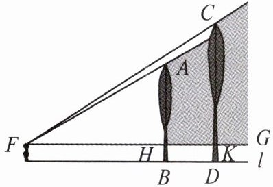 2. 小明在同一地点观察左、右并排的两棵大树 $ AB $ 和 $ CD $ 的示意图如图所示,根据图中的条件回答下列问题:视点是点____,视线是____,____,仰角分别是____,____。