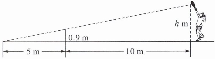 1. 如图,小明在打网球时,要使球恰好能过网,而且落在离网 $ 5 $ m 的位置上,则球拍击球的高度 $ h $ 应为( )