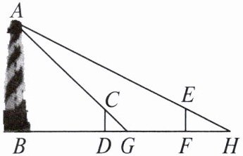 3. 如图,某水平地面上建筑物的高度为 $ AB $,在点 $ D $ 和点 $ F $ 处分别竖立高是 $ 2 $ m 的标杆 $ CD $ 和 $ EF $,两标杆相隔 $ 52 $ m,并且建筑物 $ AB $、标杆 $ CD $ 和 $ EF $ 在同一竖直平面内。从标杆 $ CD $ 后退 $ 2 $ m 到点 $ G $ 处,在 $ G $ 处测得建筑物顶端 $ A $ 和标杆顶端 $ C $ 在同一条直线上;从标杆 $ FE $ 后退 $ 4 $ m 到点 $ H $ 处,在 $ H $ 处测得建筑物顶端 $ A $ 和标杆顶端 $ E $ 在同一直线上,则建筑物的高是____ m。
