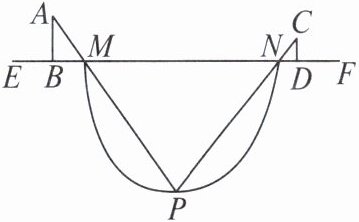 5. 小明为了测量出一深坑的深度,采取如下方案:如图,在深坑左侧用观测仪 $ AB $ 从观测出发点 $ A $ 观测深坑底部 $ P $,且观测视线刚好经过深坑边缘点 $ M $,在深坑右侧用观测仪 $ CD $ 从观测出发点 $ C $ 观测深坑底部 $ P $,且观测视线恰好经过深坑边缘点 $ N $,点 $ E $,$ B $,$ M $,$ N $,$ D $,$ F $ 在同一水平线上。已知 $ AB \perp EF $,$ CD \perp EF $,观测仪 $ AB $ 高 $ 2 $ m,观测仪 $ CD $ 高 $ 1 $ m,$ BM = 1.6 $ m,$ ND = 0.8 $ m,深坑宽度 $ MN = 8.8 $ m,请根据以上数据计算深坑深度是多少?