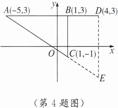 4. 已知点 $ A $,$ B $,$ C $,$ D $ 的坐标如图所示,$ E $ 是图中两条虚线的交点($ DE \perp x $ 轴)。若 $ \triangle ABC $ 和 $ \triangle ADE $ 相似,则点 $ E $ 的坐标是____。