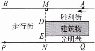 6. 如图,一段街道的两边缘所在直线分别为 $ AB $,$ PQ $,并且 $ AB // PQ $。建筑物的一端 $ DE $ 所在的直线 $ MN \perp AB $ 于点 $ M $,交 $ PQ $ 于点 $ N $。小亮从胜利街的 $ A $ 处,沿着 $ AB $ 方向前进,小明一直站在点 $ P $ 的位置等候小亮。