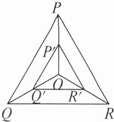 3. 如图,已知点$O是等边三角形PQR$的中心,$P'$,$Q'$,$R'分别是OP$,$OQ$,$OR$的中点,则$\triangle P'Q'R'与\triangle PQR$是____,点$O$是____,相似比是____。