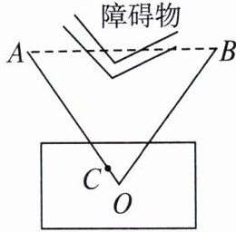 7. 如图,为测量有障碍物相隔的$A$,$B$两点间的距离,在适当处放置一水平桌面,铺上白纸,在点$A$,$B$处立上标杆,在纸上立大头针于点$O$,通过观测,在纸上确定了点$C$。已知$O$,$C$,$A$在同一条直线上,并且$OA的长为OC的100$倍,问接下来怎么做,就能得出$A$,$B$两点间的距离?
