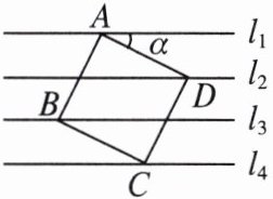 $\frac{\sqrt{5}}{5}$ 如图,过点$D$作$EF\perp l_4$,垂足为$F$,容易推出$\triangle ADE\cong\triangle DCF$,可得$AE=DF=2$,进而可得$AD=\sqrt{5}$,所以$\sin\alpha=\frac{DE}{AD}=\frac{1}{\sqrt{5}}=\frac{\sqrt{5}}{5}$.