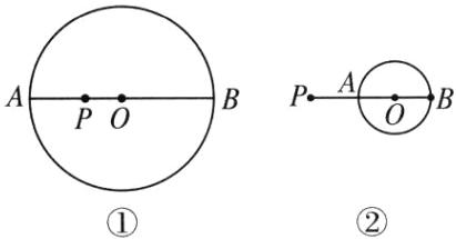 如图①,当点P在⊙O内时,PA = 4cm,PB = 10cm,AB = 14cm,因此半径为7cm;如图②,当点P在⊙O外时,PA = 4cm,PB = 10cm,直线PB过圆心O,直径AB = PB - PA = 6cm,因此半径为3cm。