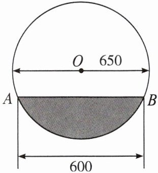 4. 在直径为 $ 650 \mathrm { mm } $ 的圆柱形油槽内装入一些油后,平行于圆柱底面的截面如图,若油面宽为 $ 600 \mathrm { mm } $,求油的最大深度。