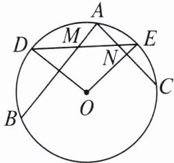 5. 如图,在 $ \odot O $ 中,$ O D $ 平分弦 $ A B $,$ O E $ 平分弦 $ A C $,求证:$ A M = A N $。