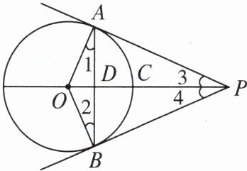 6. 如图,从⊙O 外一点 P 引圆的两条切线 PA,PB,切点分别为 A,B,OP 交⌢AB,AB 于点 C,D. 下列结论:①PO⊥AB;②∠3= ∠4;③∠1= ∠2;④⌢AC= ⌢BC;⑤AD= BD;⑥OD= CD,其中正确的是____.(填序号)