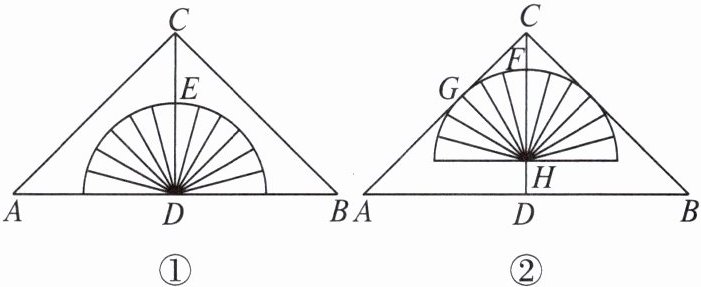 4. 如图①,将一个量角器与一张等腰直角三角形(△ABC)纸片放置成轴对称图形,∠ACB= 90°,CD⊥AB,垂足为 D,半圆(量角器)的圆心与点 D 重合,测得 CE= 5 cm,将量角器沿 DC 方向平移 2 cm,半圆(量角器)恰与△ABC 的边 AC,BC 相切,如图②,则 AB= ____ cm.