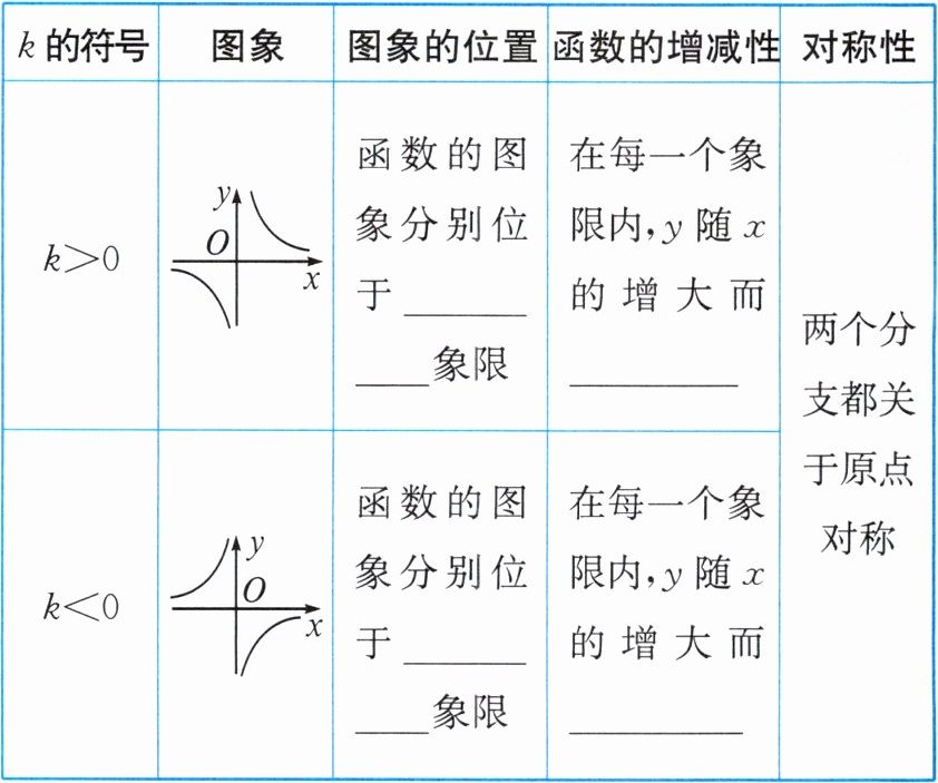| $k>0$ | | 函数的图象分别位于______象限 | 在每一个象限内,$y随x$的增大而______ | 两个分支都关于原点对称 |