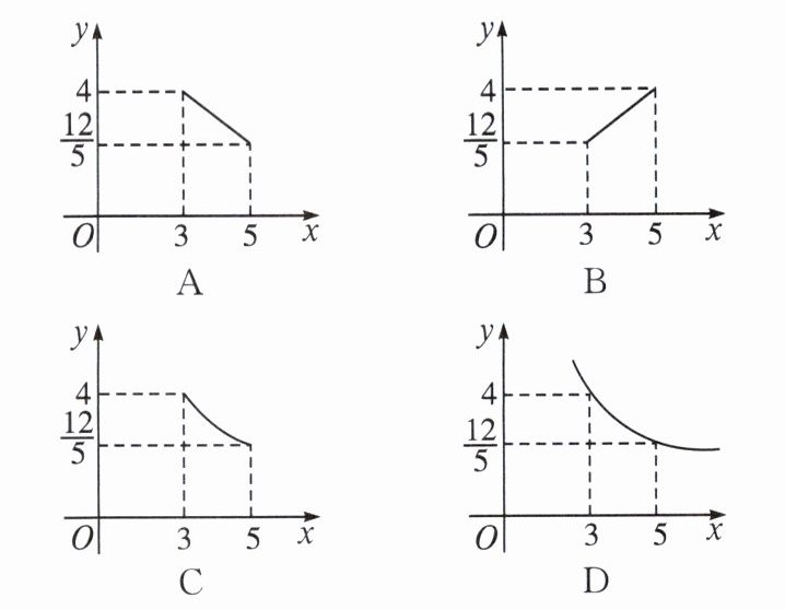 2. 如图,在矩形 $ ABCD $ 中,$ AB = 3 $,$ BC = 4 $,点 $ P $ 在 $ BC $ 边上运动,连接 $ DP $,过点 $ A $ 作 $ AE \perp DP $,垂足为 $ E $,设 $ DP = x $,$ AE = y $,则能反映 $ y $ 与 $ x $ 之间的函数关系的图象是( )