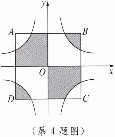 4. 如图,边长为 $ 4 $ 的正方形 $ ABCD $ 的对称中心是坐标原点 $ O $,$ AB // x $ 轴,$ BC // y $ 轴,反比例函数 $ y = \frac{2}{x} $ 与 $ y = -\frac{2}{x} $ 的图象均与正方形 $ ABCD $ 的边相交,则图中阴影部分的面积之和是______.