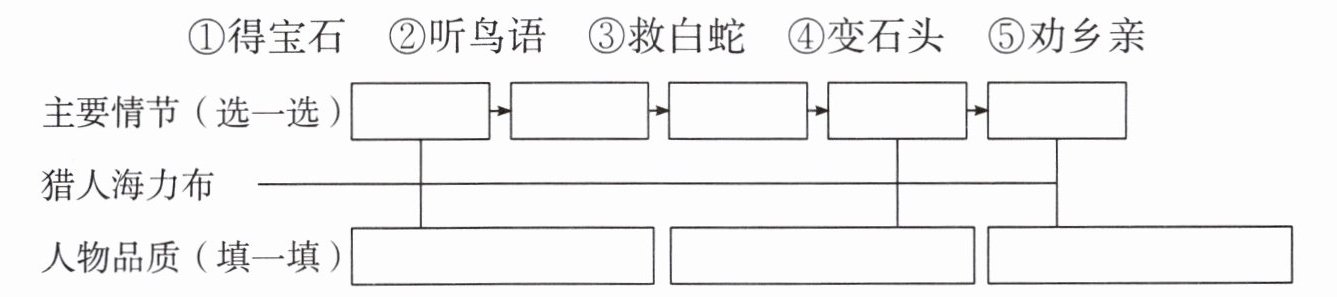 主要情节(选一选)$\begin{array}{c}□ \\ 猎人海力布\end{array} \to \begin{array}{c}□ \\ \end{array}\to \begin{array}{c}□ \\ \to \begin{array}{c}□ \\ \end{array}\to \begin{array}{c}□ \\ \to \begin{array}{c}□ \\ \to \begin{array}{c}□ \\ \end{array}\to \begin{array}{c}□ \\ \to \begin{array}{c}□ \\ \to \begin{array}{c}□ \\ \to \begin{array}{c}□ \\ \end{array}\to \begin{array}{c}□ \\ \to \begin{array}{c}□ \\ \to \begin{array}{c}□ \\ \to \begin{array}{c}□ \\ $