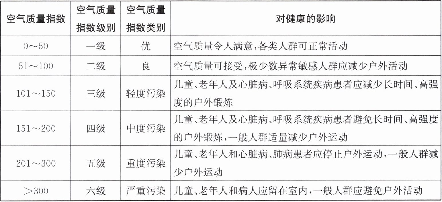 |空气质量指数|空气质量指数级别|空气质量指数类别|对健康的影响|