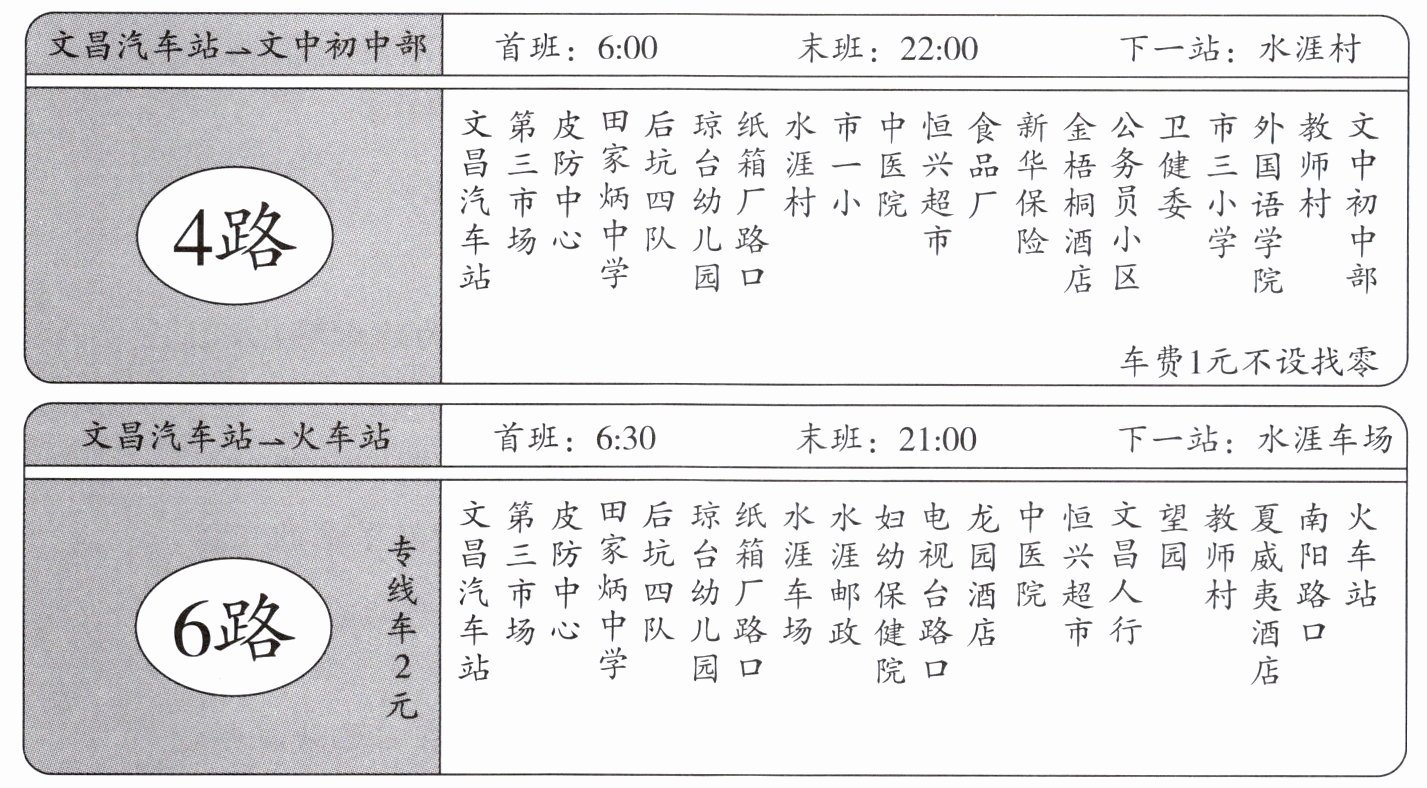 1. 小宇家在文昌汽车站附近,他周六早上要在6点40分前赶到纸箱厂路口,和同学们一起参观纸箱厂,他怎样乘车最合适?请你为他做出规划并说明理由。______