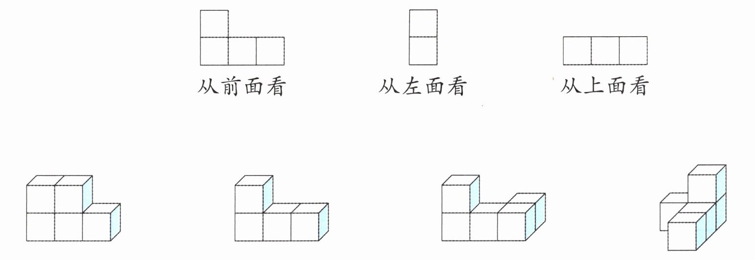 第二个图形:底层3个,上层左边1个,从前面看符合;从左面看是2个上下正方形,符合;从上面看是3个横向正方形,符合。