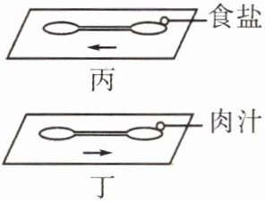 ⑤ 在探究“草履虫对外界刺激的反应”实验中,先取两块载玻片,在每块载玻片的两端各滴一滴草履虫培养液,然后使两滴培养液连通起来。在两块载玻片右侧的培养液边缘,分别放一小粒食盐(如图丙)和一滴肉汁(如图丁),用放大镜观察草履虫的移动方向。实验中每个装置中都不止一只草履虫,目的是