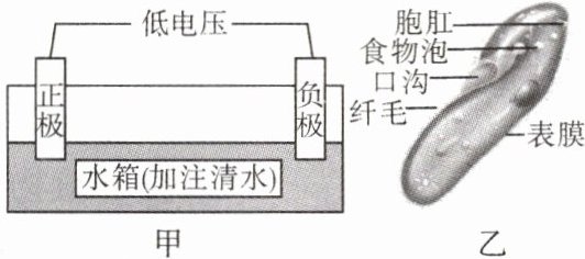 (1)①生物能对外界刺激作出反应,草履虫遇到电刺激作出反应,体现了其对环境的适应。②因为草履虫在微弱电流刺激下会由正极游向负极,所以取水样滴入正极一侧,这样草履虫会游向负极,从而分离出来。从图乙可以看出,草履虫依靠纤毛的摆动进行运动。