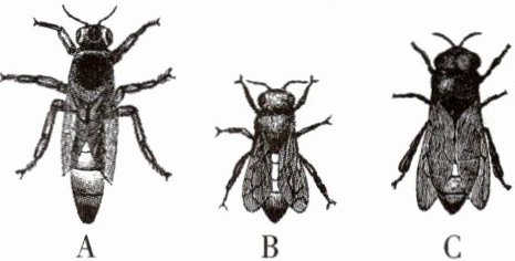 【解析】:蜜蜂是典型的社会性昆虫,蜂群通常由蜂王、工蜂和雄蜂三种类型的蜜蜂组成,它们在形态结构和功能上有明显差异。