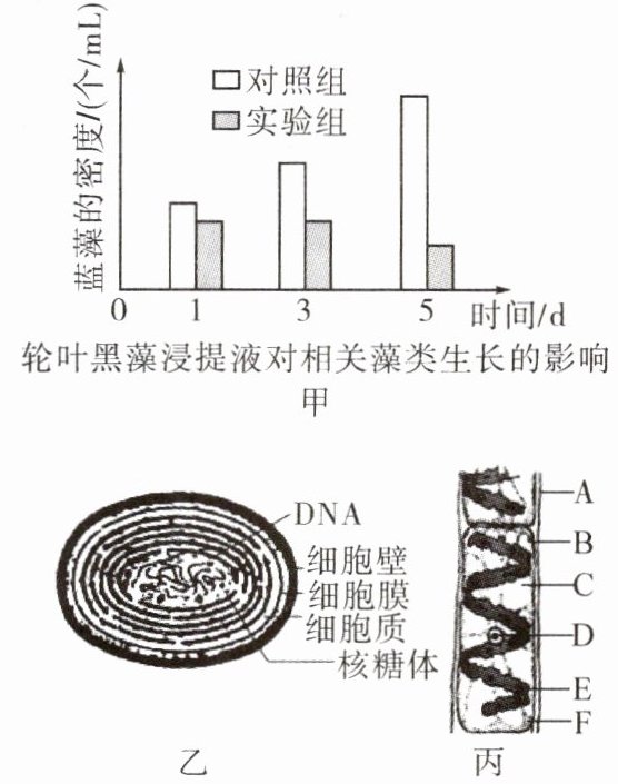 7. 水体富营养化使蓝藻、绿藻等生物迅速生长和繁殖,导致水华频繁发生,水华不仅破坏水体生态系统,还会损害人体健康。某研究小组通过实验研究了大型沉水植物轮叶黑藻浸提液对铜绿微囊藻(蓝藻)和池塘混合藻类(绿藻)的影响作用。观察蓝藻的细胞结构示意图(如图乙)和水绵(绿藻门)的细胞结构图(如图丙),分析回答如下问题。