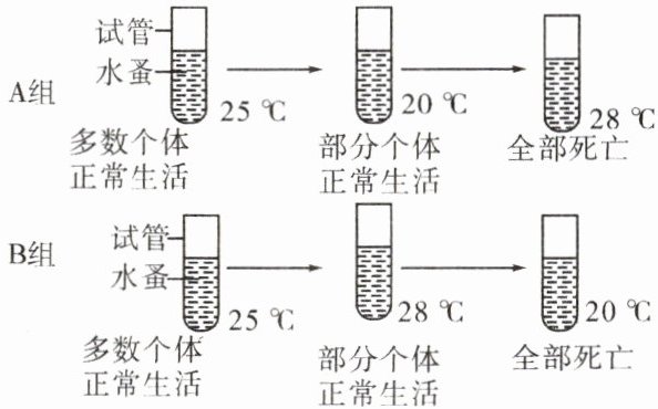 10. 某兴趣小组的同学用等量的水蚤分别做了如图所示的A、B两组实验:水温的改变是实验的唯一变量,其他条件均相同;水蚤在水中的时间均为12小时。实验过程和实验现象如图所示。请回答下列问题。