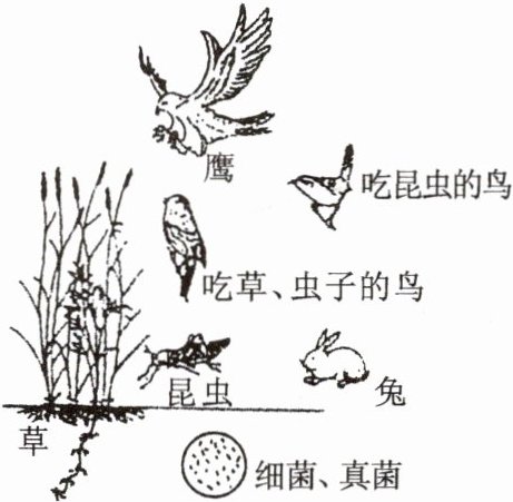 (2)消费者是直接或间接以植物为食的动物,图中鹰、吃昆虫的鸟、吃草和虫子的鸟、昆虫、兔都是动物,属于消费者。