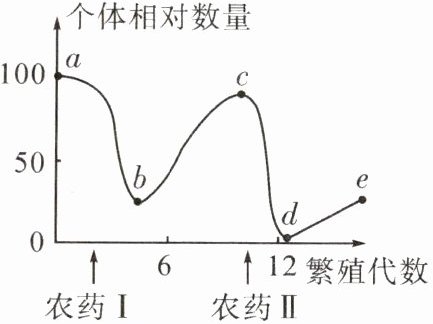 (3)ab段下降的原因是农药对害虫进行了定向选择,抗药性弱的个体被淘汰;b点不为零的原因是少数抗药性强的个体存活下来;bc段迅速上升体现了害虫有过度繁殖的倾向;de段上升是因为害虫的抗药性在农药Ⅱ的选择作用下,具有抗药性的个体数量逐渐增加,而不是农药Ⅱ使害虫产生了更强的抗药性变异。