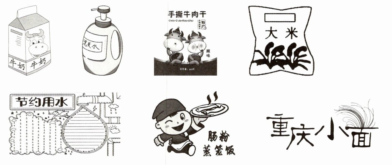 【答案】:牛奶、洗发水、手撕牛肉干、大米、节约用水、肠粉、蒸笼饭、重庆小面(圈出其中认识的即可)