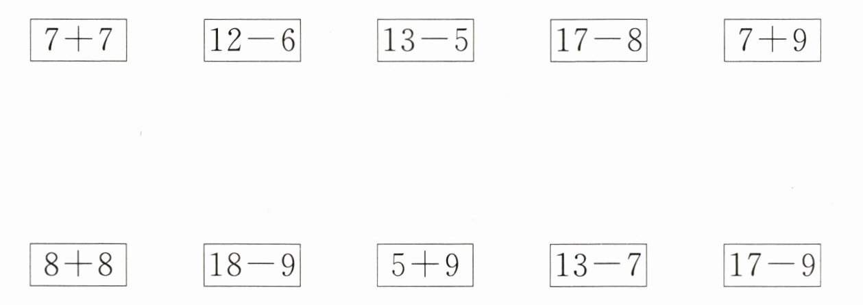 【答案】:$7 + 7$连$5 + 9$;$12 - 6$连$13 - 7$;$13 - 5$连$17 - 9$;$17 - 8$连$18 - 9$;$7 + 9$连$8 + 8$。