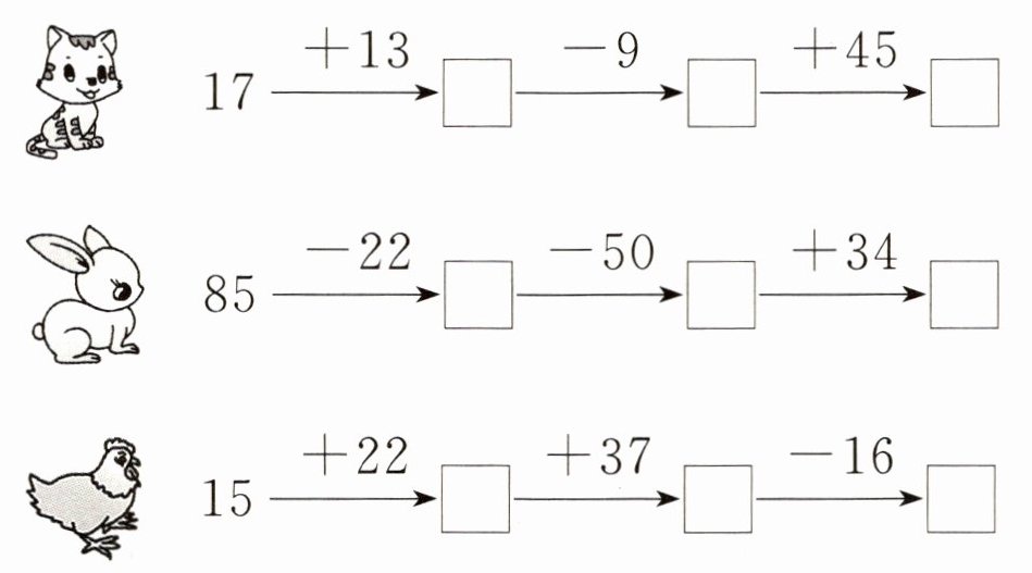 $5 + 38 = 43$;$82 - 17 = 65$;$28 + 63 = 91$。