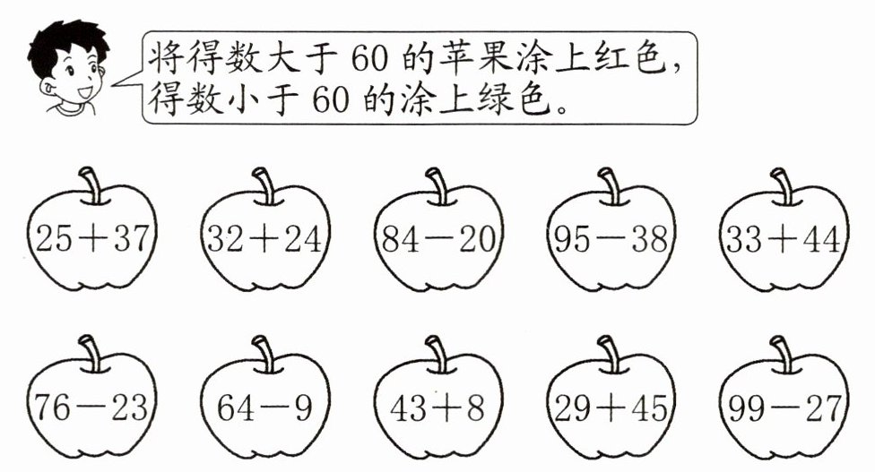 将得数大于60的苹果涂上红色,得数小于60的涂上绿色。