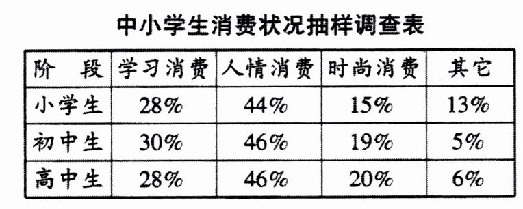 (1)在学校组织的中小学生消费调查活动中,通过调查统计,得到“中小学生消费状况抽样调查表”,请仔细分析表格,概括主要信息。