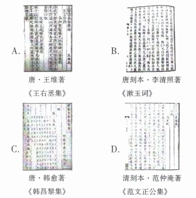 B【解析】李清照是宋代女词人,婉约词派代表,有“千古第一才女”之称,她不是唐代的,故不可能出现“唐刻本·李清照著《漱玉词》”。故选 B。