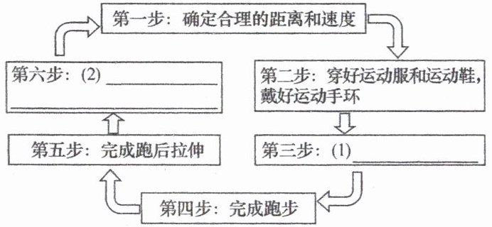 12. 跑步锻炼需要循序渐进,并根据自身情况合理调整。依据材料,某同学设计了一份暑假夜跑锻炼流程图,请你帮他完善。(4分)