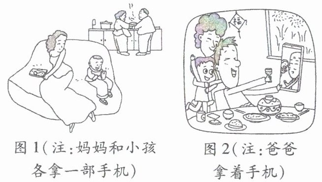 (2) 示例:我认为在互联网技术、交通方式发达的今天,尽孝道与距离远近无关。图 1 中,妈妈、孩子虽与家中老人共处一室,咫尺距离,但各自沉迷手机,让老人做家务,并没有尽孝道;图 2 中,一家三口通过视频与老人祝酒言欢,让老人得到幸福的陪伴,虽天各一方,但其孝心溢于言表。