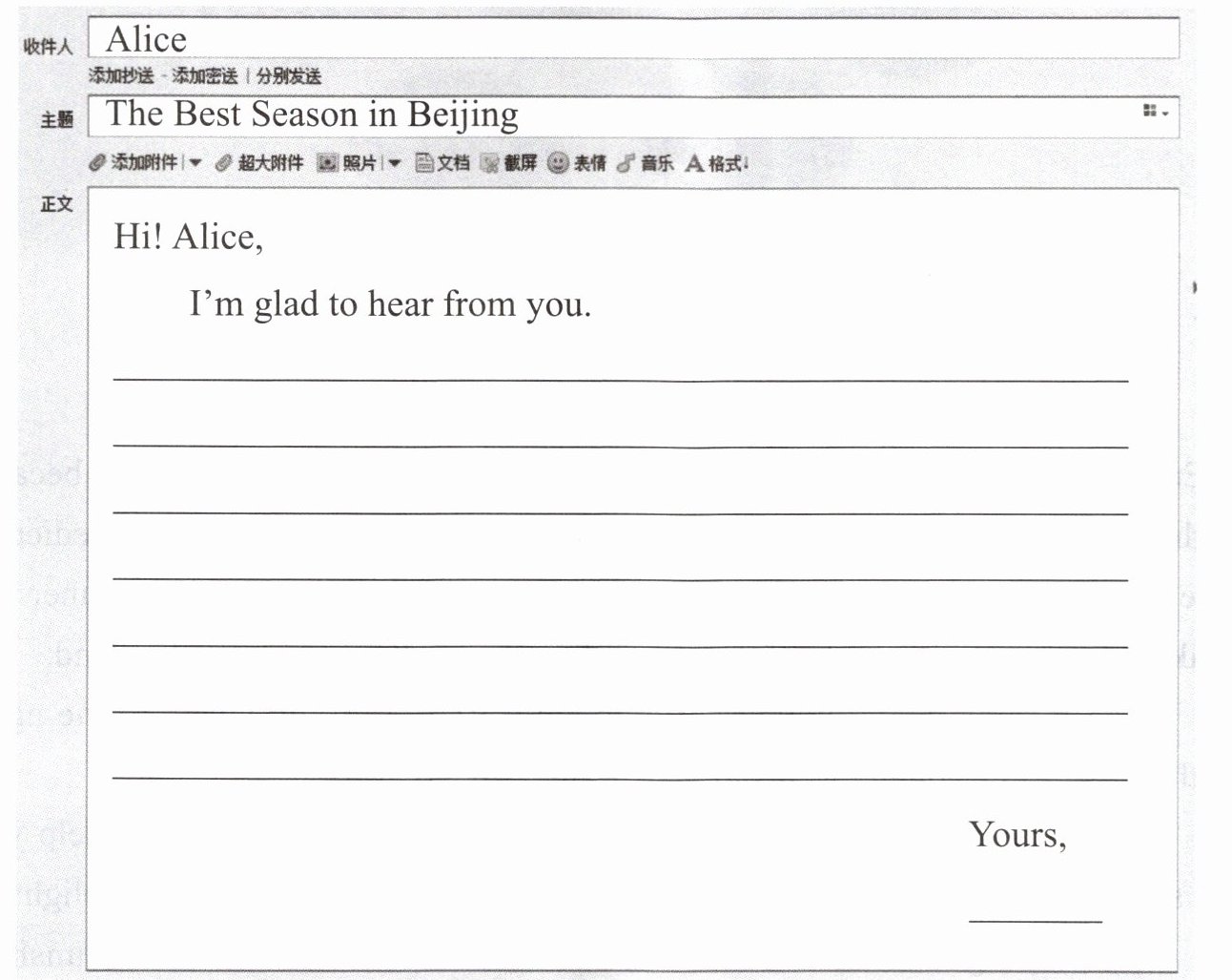 【解析】:这篇邮件需要向Alice介绍北京四季变化,并给出最合适的旅游季节、衣物建议及注意事项。首先,简要描述北京四季的特点:春季干燥多风,夏季炎热多雨,秋季凉爽宜人,冬季寒冷干燥。接着,推荐秋季(9-10月)为最佳旅游季节,因为天气舒适,景色优美。然后,针对秋季建议携带薄外套、长袖衣物等,并提醒注意事项,如提前预订景点门票、使用公共交通等。最后表达期待见面的心情。