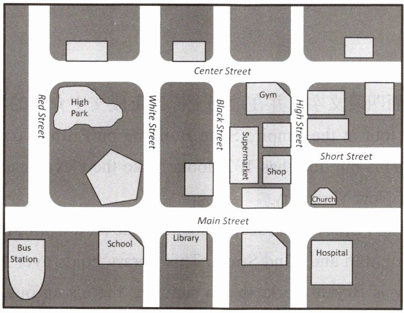 Bobby 是从美国来你校学习的新生。下图是你校所在社区的地图,请你给 Bobby 介绍一下社区的地理环境。
