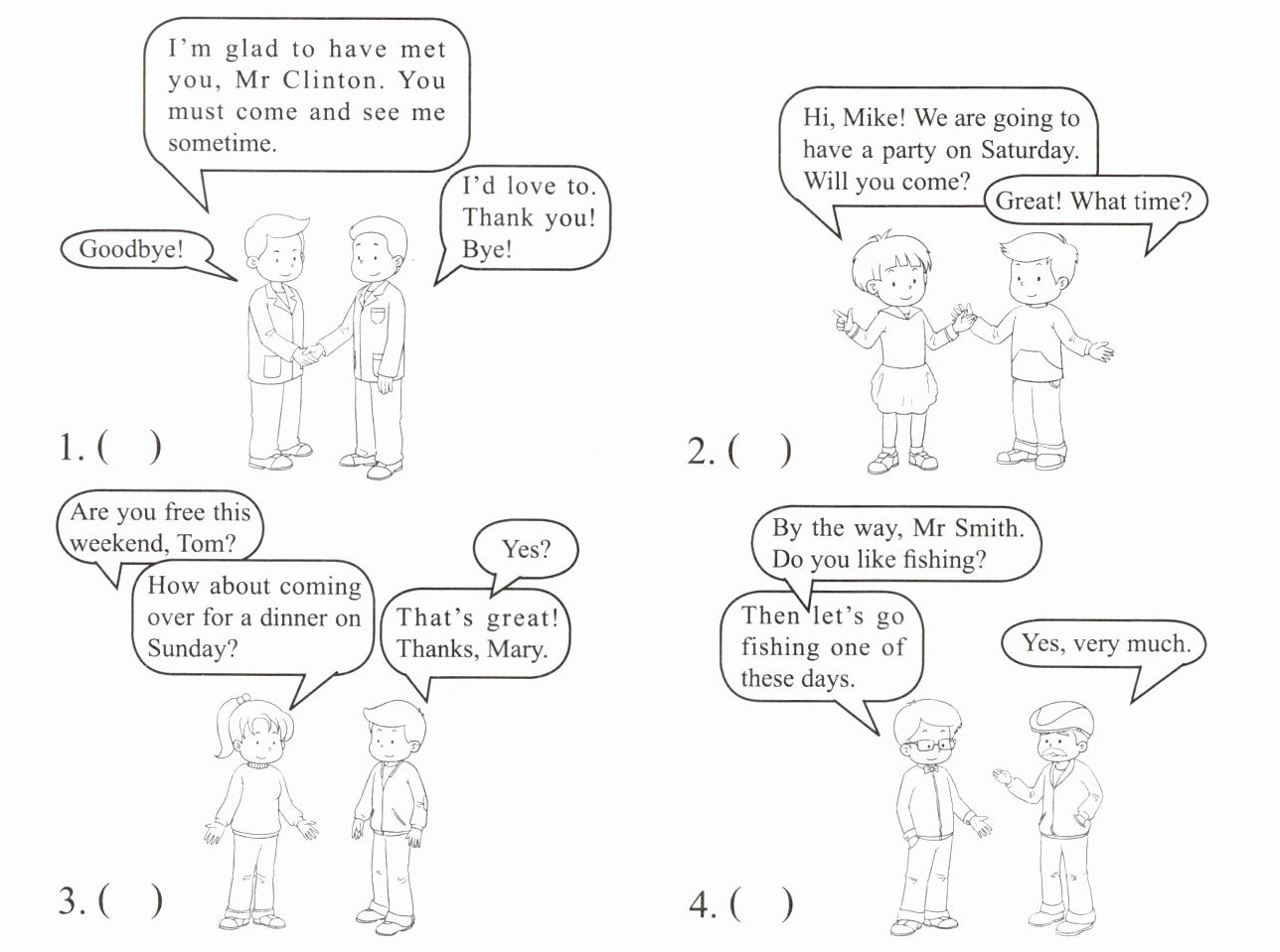 阅读短文,然后判断图中哪些对话表示邀请(I),哪些仅仅表示客气(F)。