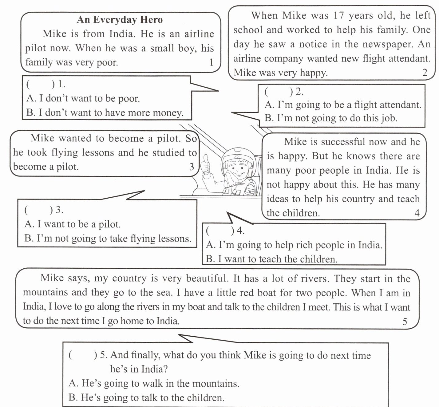 阅读飞行员 Mike 的生平,每读一段,猜猜他会说些什么,选择 A 或 B。
