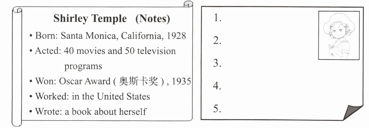 请看下面的记录,然后写出有关 Shirley Temple 生平的完整句子。