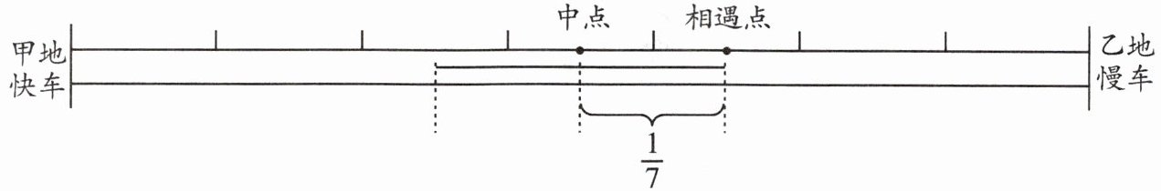【分析】画线段图理解题意,把甲、乙两地之间的距离看作单位“1”,那么快车行了全程的一半加全程的$\frac{1}{7}$,慢车行了全程的一半减全程的$\frac{1}{7}$。由此可知快车比慢车在 3 时内多行了 2 个全程的$\frac{1}{7}$。