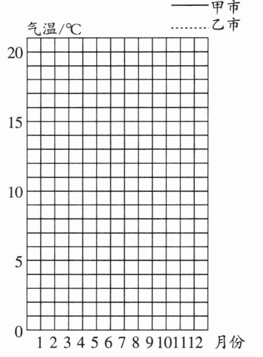 1. (绘制折线统计图:根据甲、乙两城市各月气温数据,在图中分别用实线(甲市)和虚线(乙市)依次连接对应点,具体绘图过程略)