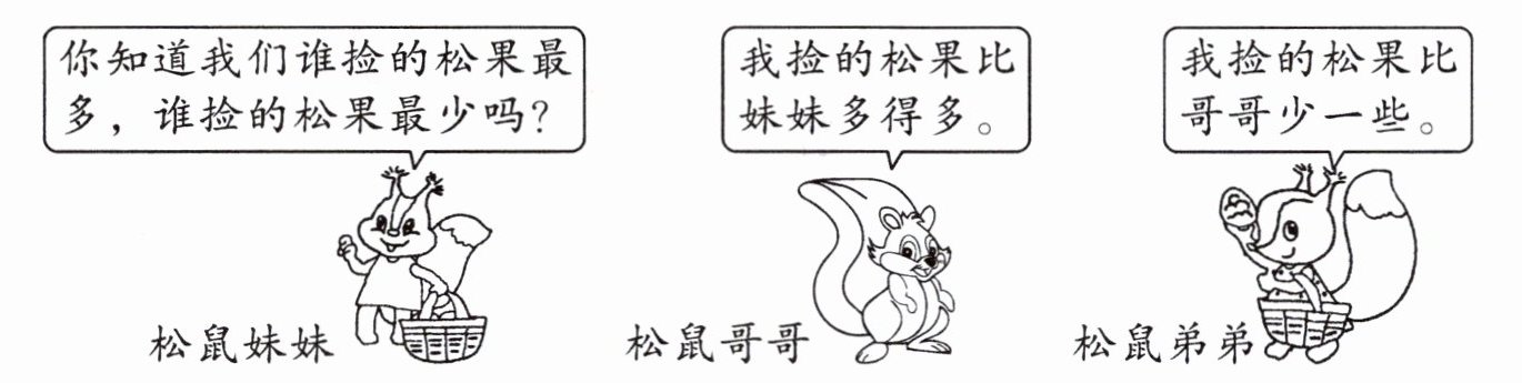 从松鼠妹妹的话“你知道我们谁捡的松果最多,谁捡的松果最少吗?”可知,需要判断三只松鼠捡松果数量的多少关系。